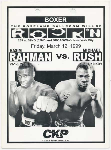 Heavyweights Hasim Rahman and Michael Ruch tangled in the Roseland Ballroom in NYC, with the bigger man (by almost 20 pounds) Rahman taking the win by a stoppage in the 5th of 10 caused by a cut above Rush’s eye. |