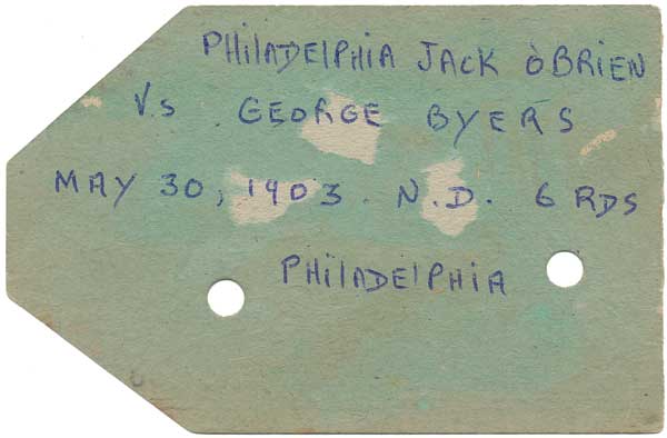 As he faced off against Boston's light heavyweight George Byers in his native namesake, the current middleweight king of the world, Philadelphia Jack O’Brien was unbeaten in the United States and Great Britain in more than 45 fights since falling to Young Peter Jackson, the Baltimore Demon, in the 13th of a 20-frame match in San Francisco on the 14th of February, 1900. With the date pushed up a week and the venue moved to the National Athletic Club, rather than Hoffman’s, in his hometown, O’Brien took on the venerable Prince Edward Island native Byers, winning the 6-round contest, in the opinion of the Philadelphia Item’s reporter. The paper also noted that veteran Philly lightweight puncher Billy Willis easily handled the rookie John Loxley in their 6-round bout, perhaps not harshly enough to dissuade Loxley from taking a rematch the next month, where the lad suffered a knockout in the 3rd. |